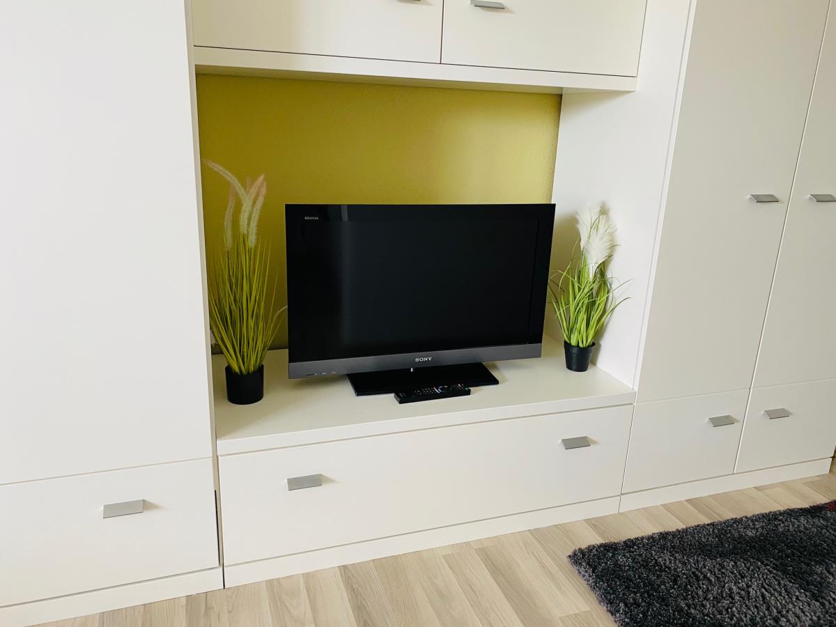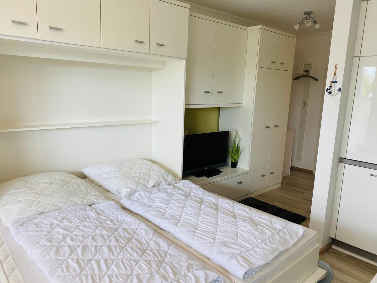 Die Wohnung hat einen Wohnraum mit Schrankbett für 2 Personen (Liegefäche 160x200cm), kleine Essecke mit Sitzmöglichkeit für 2 Personen, TV Flachbildschirm und Zugang zum Balkon.