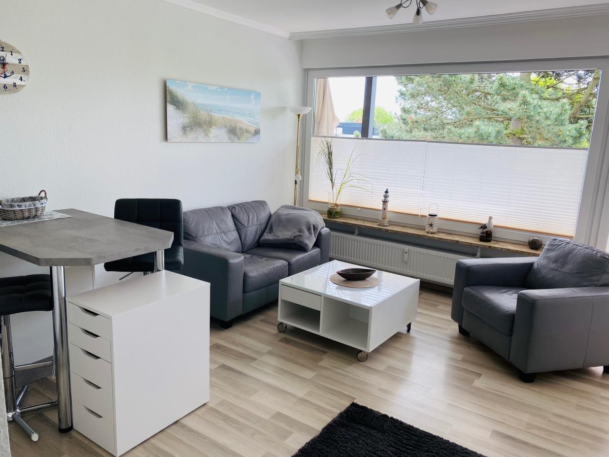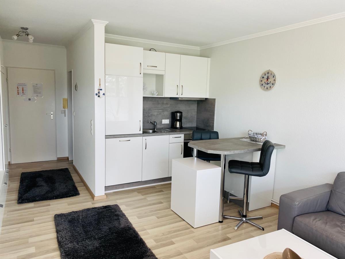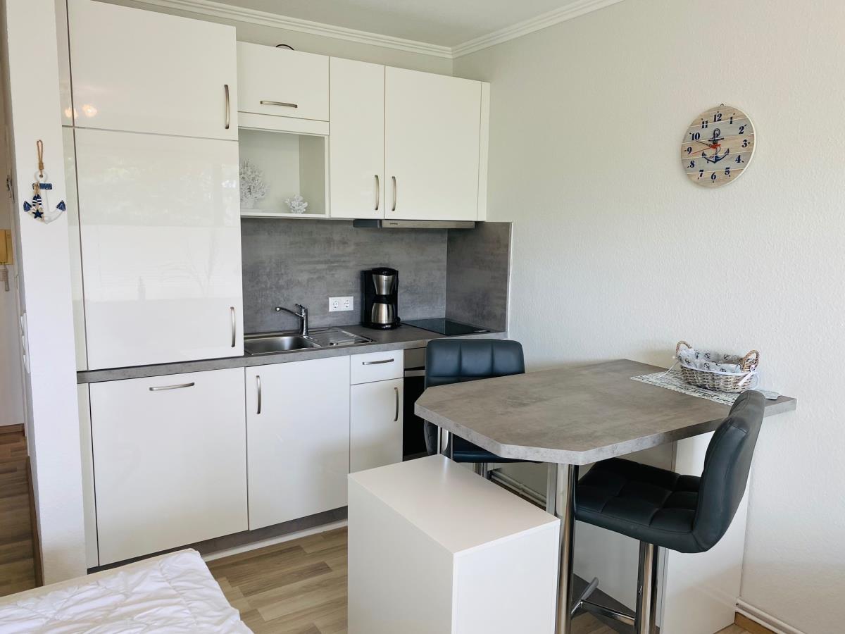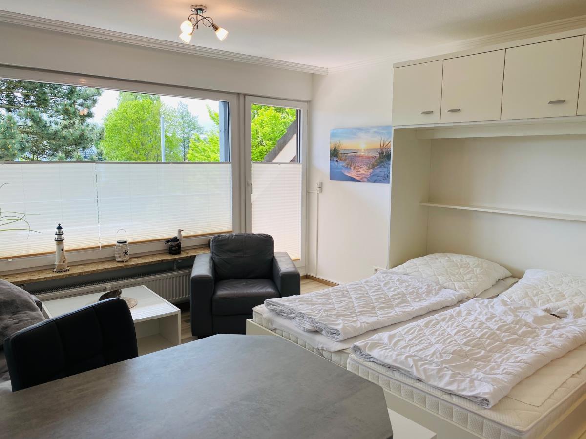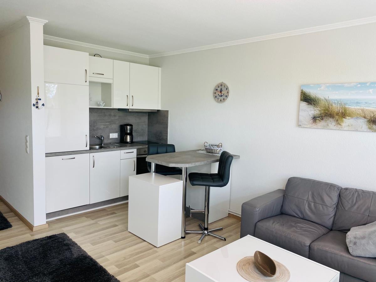 Frisch renovierte, moderne und helle 1-Zimmer Ferienwohnung für max. 2 Personen mit einer Wohnfläche von ca. 30m² in 1. Reihe in Scharbeutz mit Teil-Meerblick vom Balkon.