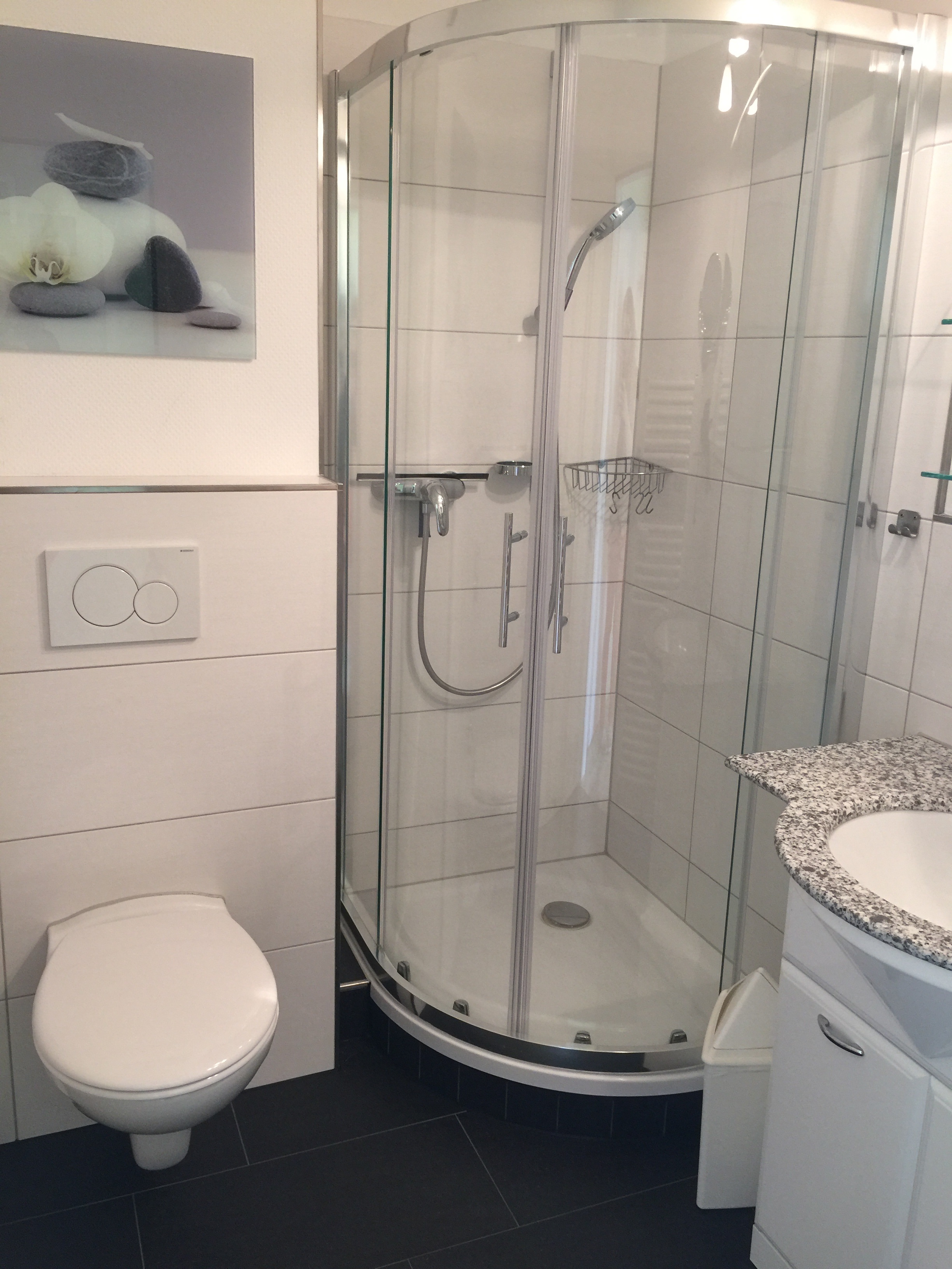 Das moderne Bad ist mit einer Dusche, WC, Waschbecken und Handtuchheizkörper ausgestattet.