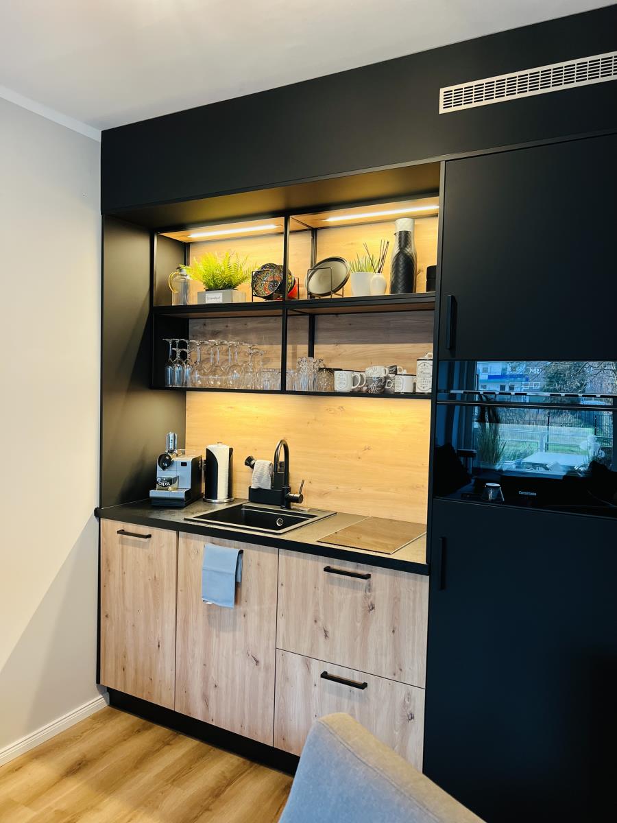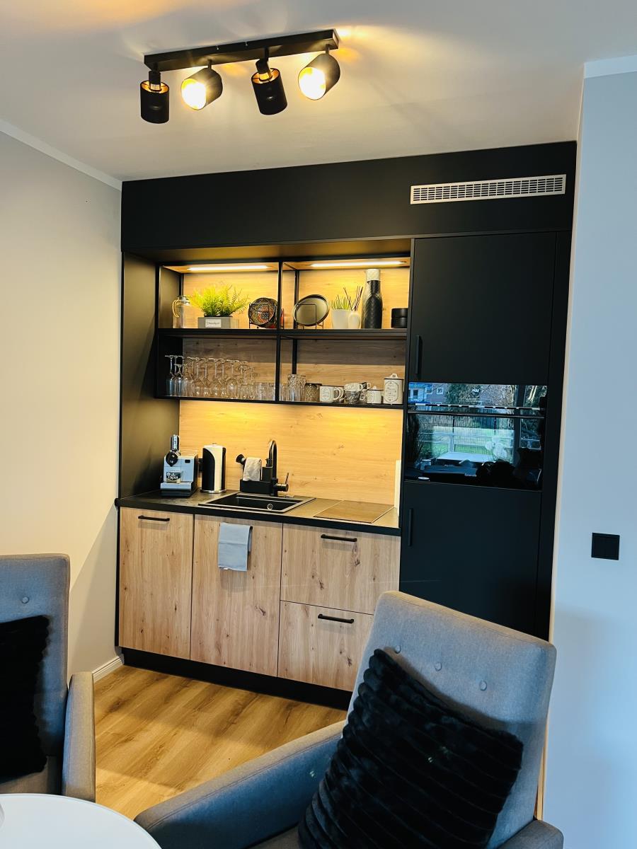 Die hochwertige Küchenzeile verfügt über einen Backofen, Spülmaschine, Cerankochfeld, Kühlschrank mit Gefrierfach, Filterkaffeemaschine, Kapselkaffeemaschine, Toaster, Wasserkocher und ausreichend Küchenutensilien.