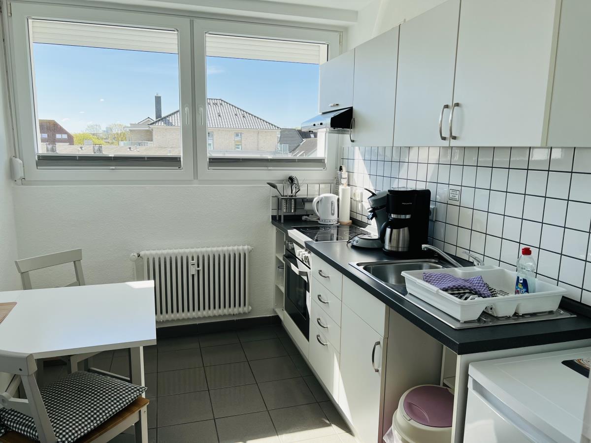Die moderne Einbauküche verfügt über ein Cerankochfeld, Backofen, Kühlschrank mit Gefrierfach, Kaffeemaschine, Toaster, Wasserkocher und Essecke mit Sitzmöglichkeit .