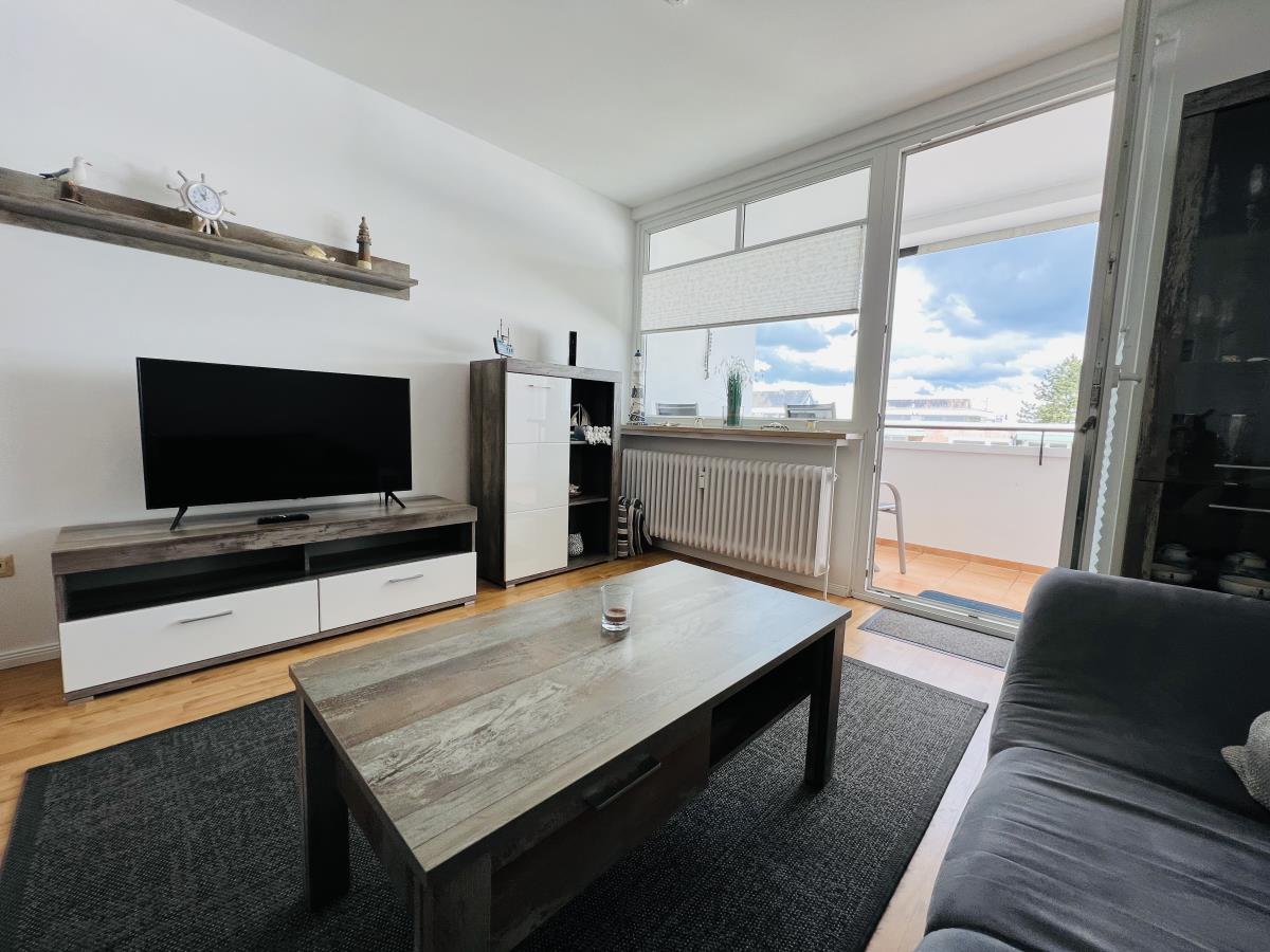 Die Wohnung hat einen Wohnraum mit Ecksofa, TV Flachbildschirm und Zugang zum Balkon.
