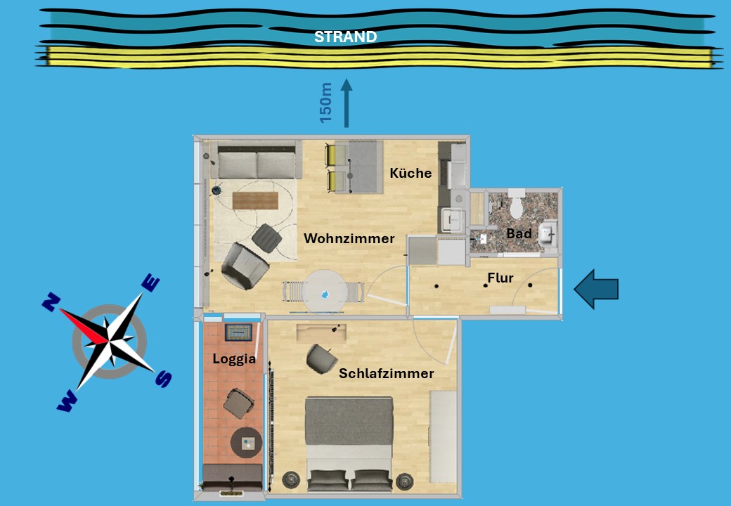 Du wohnst mitten im Herzen von Scharbeutz und bist trotzdem sofort im Urlaubsmodus: Strand, Promenade, Cafés, Bäcker und Restaurants liegen nur wenige Schritte entfernt. Dein Auto kannst du entspannt auf dem privaten Parkplatz direkt am Eingang stehen lassen. Nach 6 Stufen am Hauseingang bringt euch ein neuer Fahrstuhl bequem bis vor die Wohnungstür.