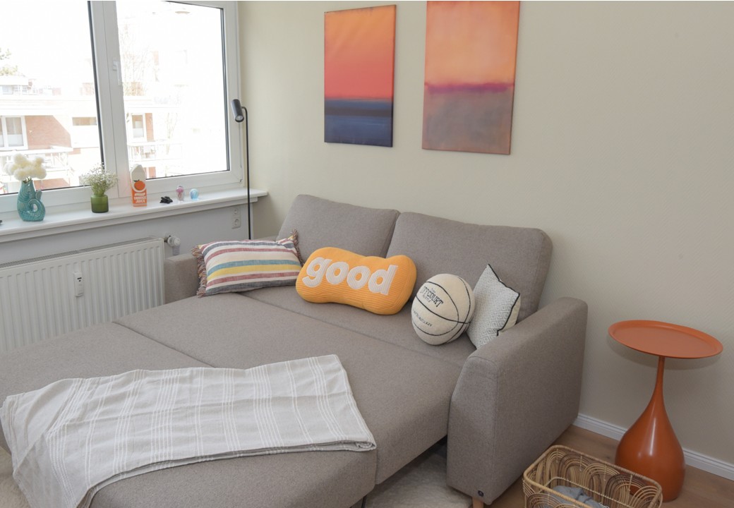 Für erholsame Nächte sorgt ein 1,80 m breites Bett mit ergonomischen Matratzen, verschiedenen Kissen, smarter Beleuchtung und vollständiger Verdunklung im Schlafzimmer. Im Wohnzimmer lädt das große Schlafsofa (160 x 200 cm) zum Entspannen, Lesen oder bequemen Schlafen ein.