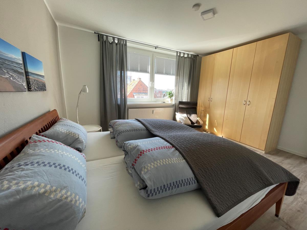 Das Schlafzimmer besteht aus einem Doppelbett 180 x 200cm und geräumigem Kleiderschrank.