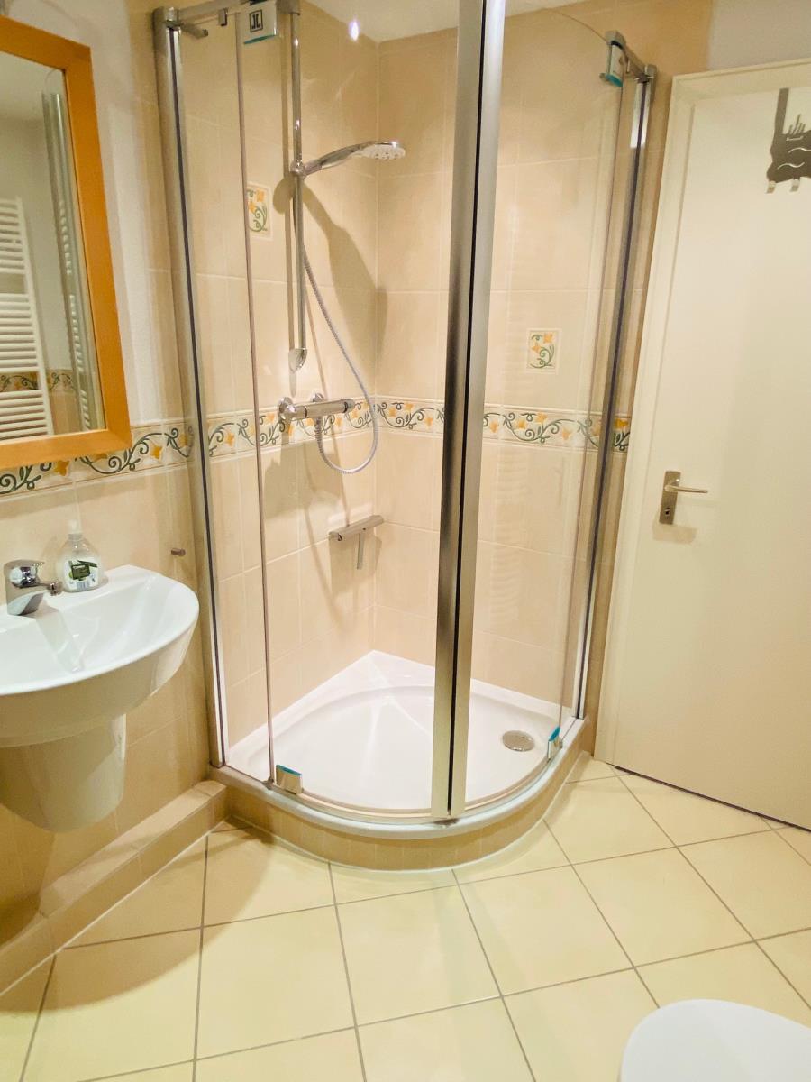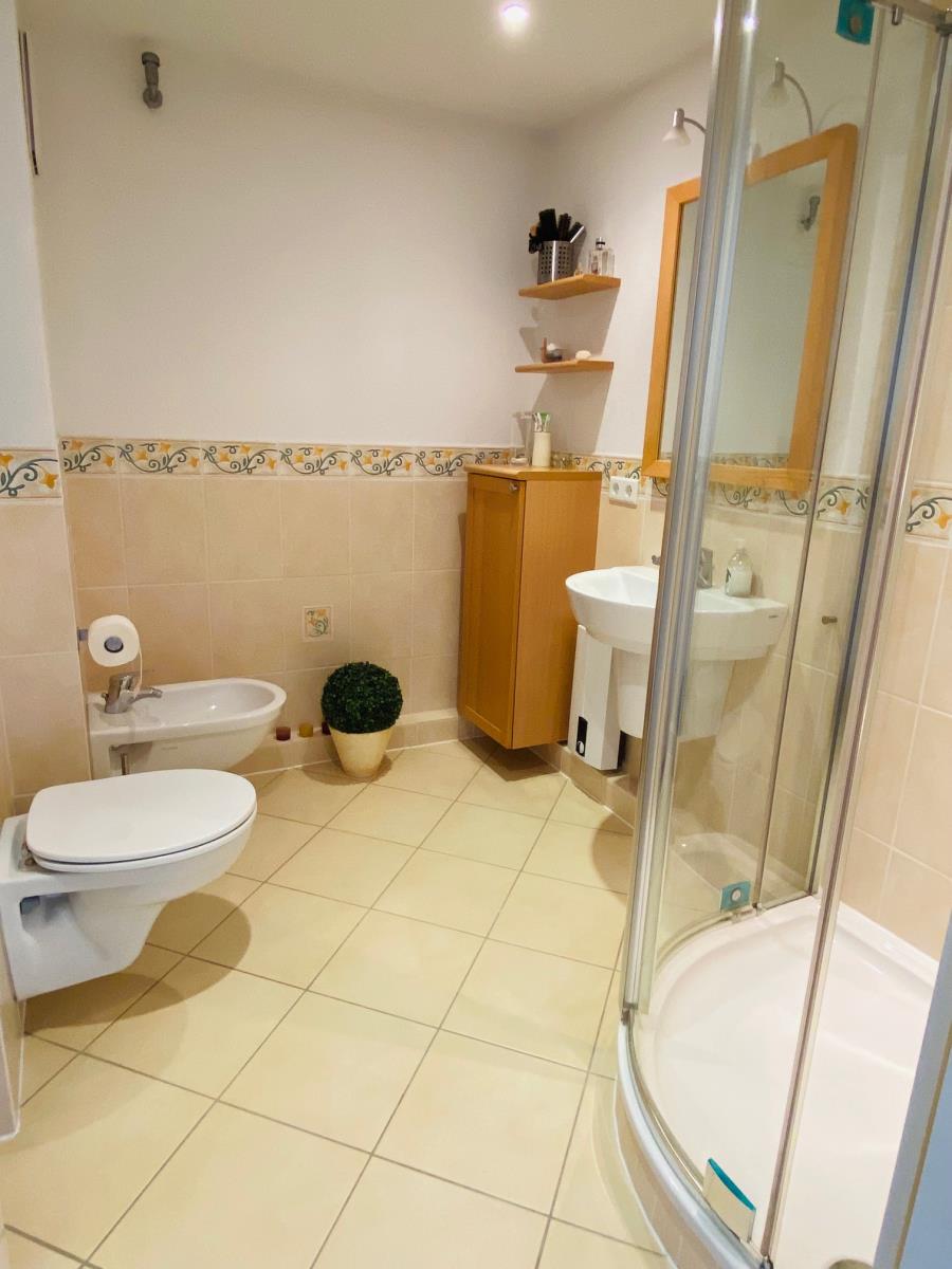 Das moderne Bad ist mit einer Dusche, WC, BD, Waschbecken und Handtuchheizkörper ausgestattet.