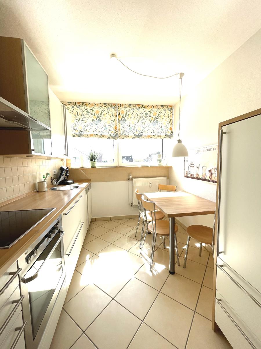 Die moderne Einbauküche verfügt über ein Cerankochfeld, Backofen, Kühlschrank mit Gefrierfach, Kaffeefiltermaschine, Senseo-Padmaschine und Kapsel-Maschine,Toaster, Wasserkocher, Spülmaschine und Essecke mit Esstisch.