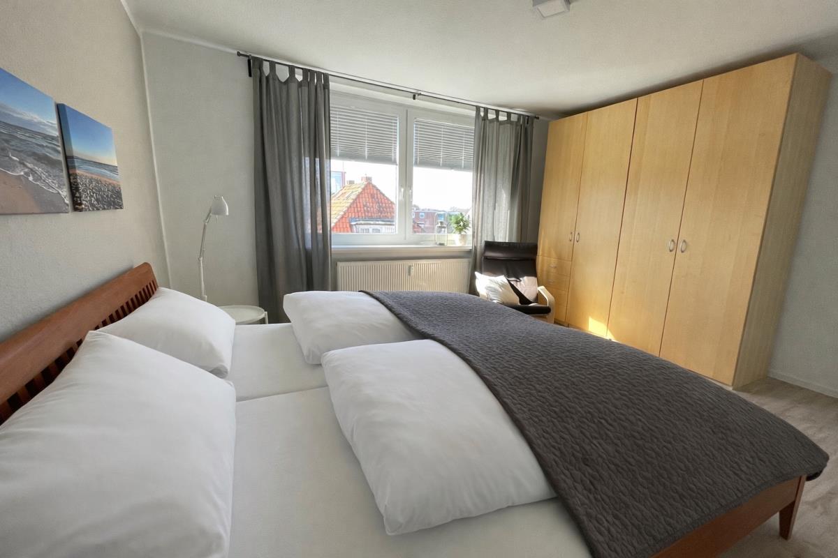Das Schlafzimmer besteht aus einem Doppelbett 180 x 200cm und geräumigem Kleiderschrank.